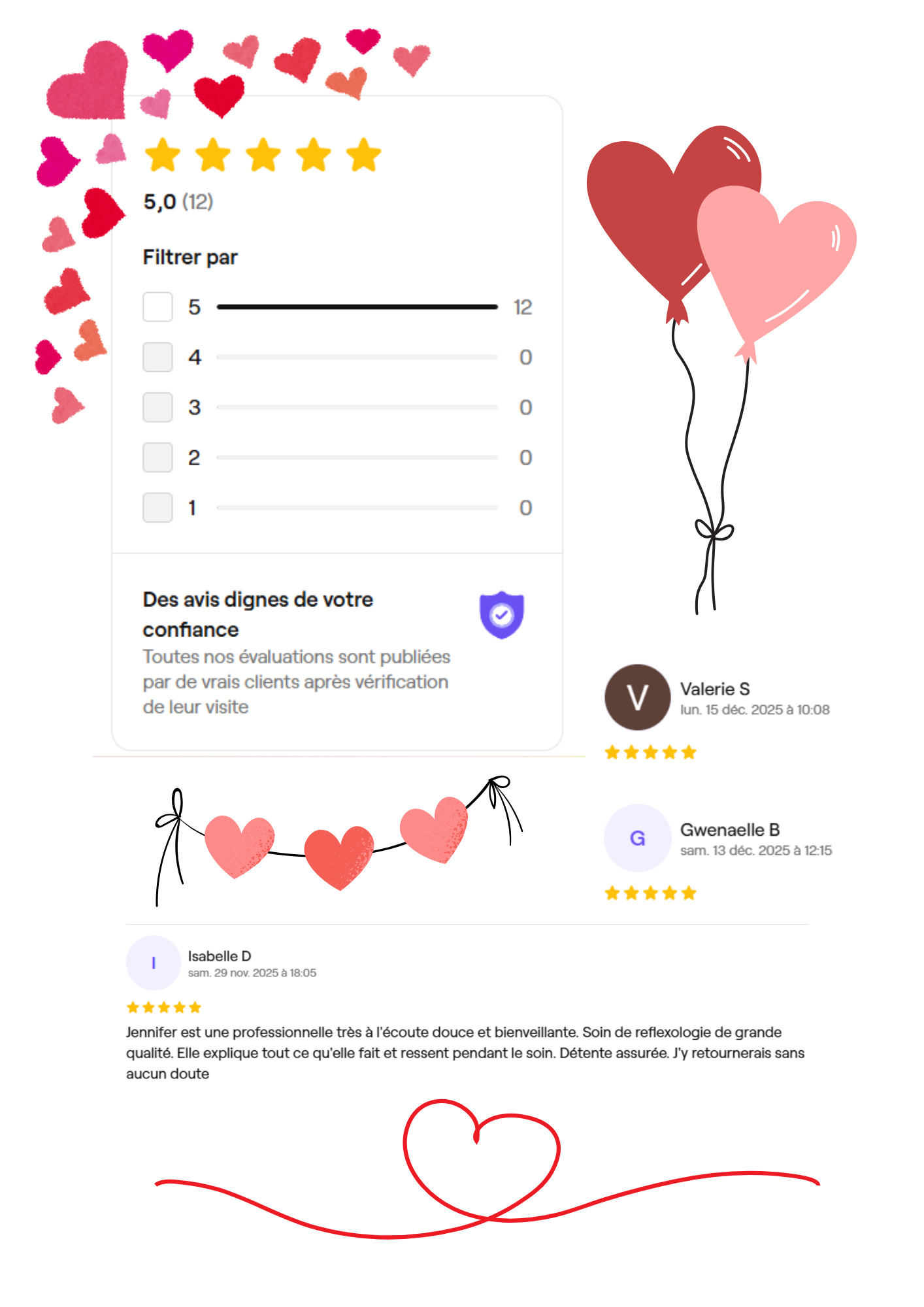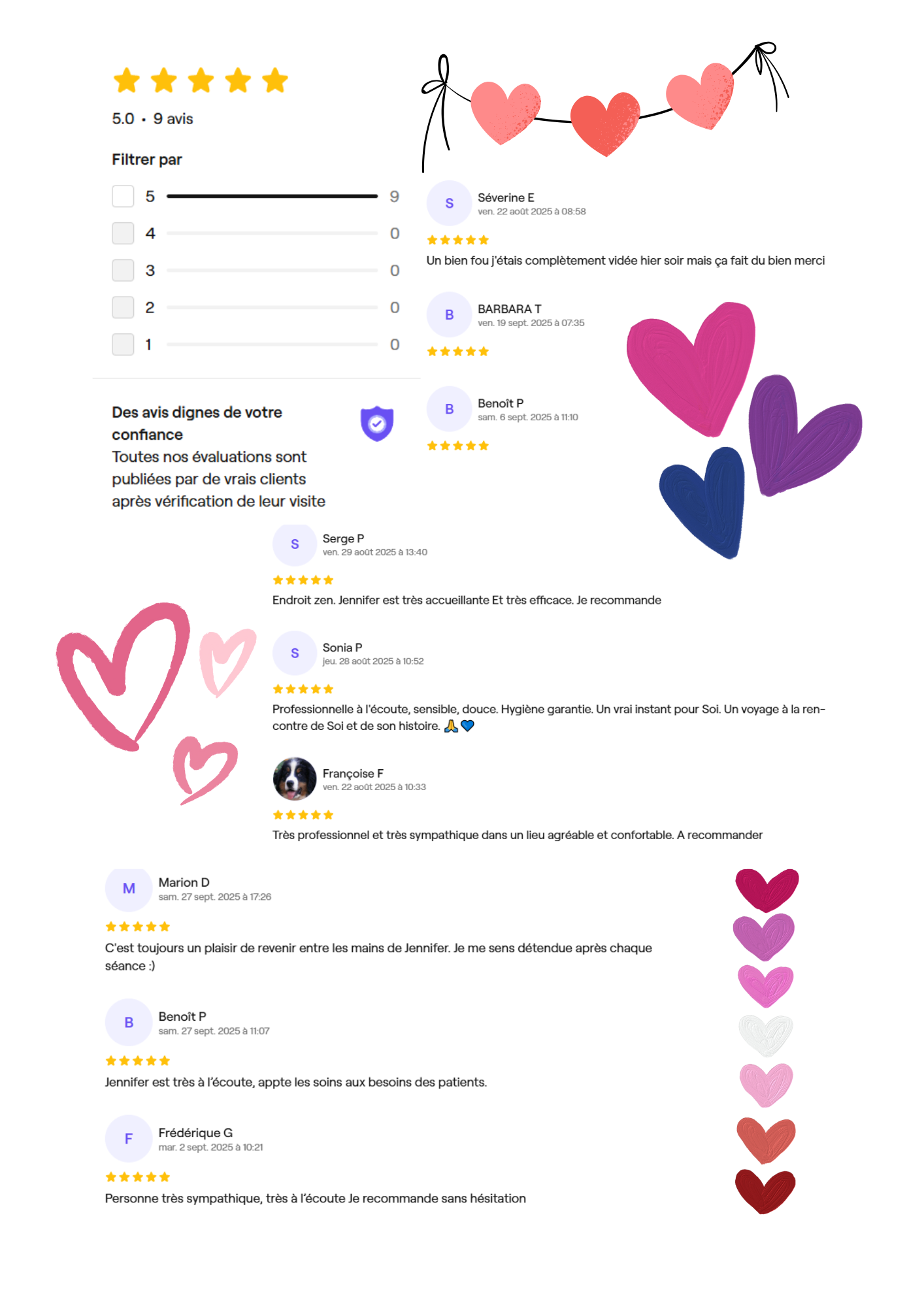 « J’ai consulté Jennifer pour des troubles du sommeil persistants et des douleurs lombaires chroniques. Dès la première séance, j’ai ressenti une détente profonde et un vrai soulagement. Après quelques séances, mes nuits sont redevenues paisibles, mes douleurs se sont nettement atténuées et je me sens beaucoup plus ancrée au quotidien. Jennifer a des mains magiques et une écoute rare. » Amandine G